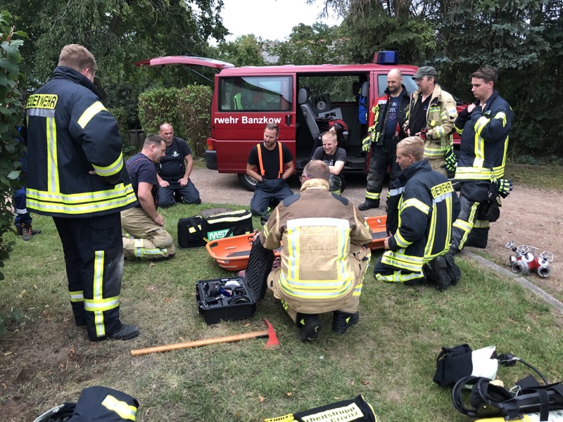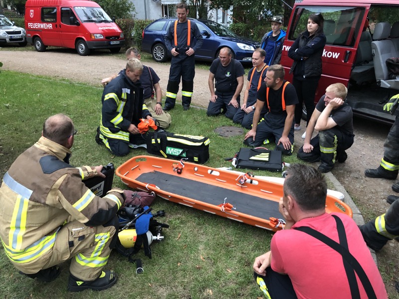 Am Mittwoch war die A.N.T.S. in Mirow zu Besuch und simulierte eine entsprechende Einsatzsituation. Im Obergeschoss des abgedunkelten Feuerwehrhauses war ein Mitglied eines Angriffstrupps bewusstlos zusammengebrochen. Sein Partner alarmierte daraufhin über Funk die A.N.T.S., welche nun mit vier Mann zur Rettung anrückte. Ohne Sicht wurde der verunfallte Kamerad und sein Partner innerhalb weniger Minuten aus dem Gebäude gebracht.